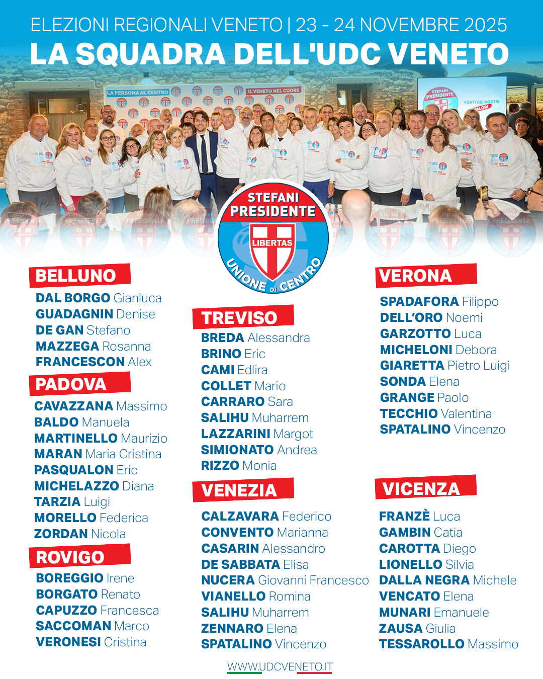 Siamo lieti di presentarvi i candidati della lista UDC – Unione di Centro, a sostegno del candidato presidente della coalizione di centrodestra Alberto Stefani alle Elezioni Regionali del Veneto del 23 e 24 novembre 2025.